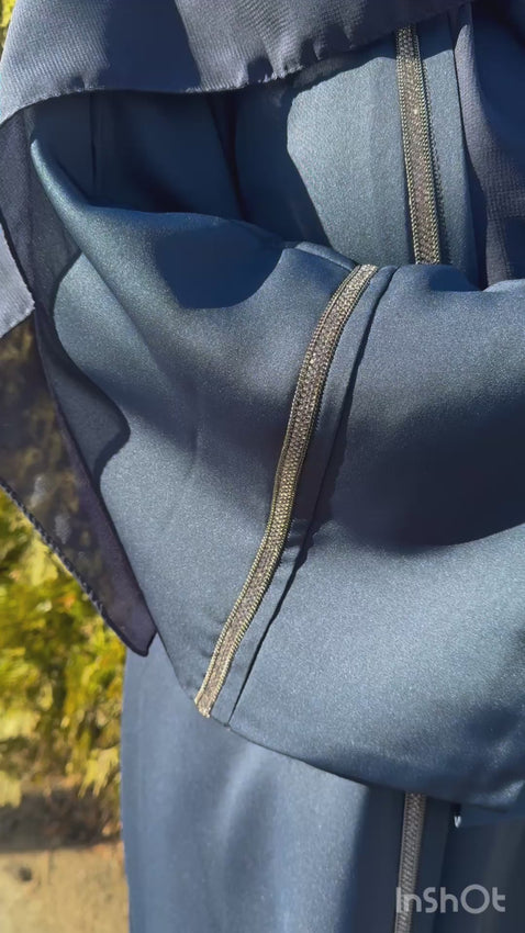2: A navy blue outer open abaya with rhinestone trims on the front of the cardigan and the sleeve cuffs