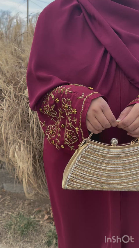 Inspired by the beauty of roses and a touch of elegance, the design of our Warda Abaya was created. The sleeves are a statement piece with beautiful golden beads hand embroidered on deep maroon nida fabric that gives this abaya a nice silky smooth finish.